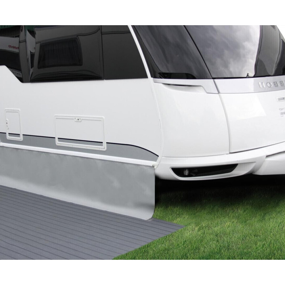 Draught skirt in soft fabric with linen structure from Hindermann. Keeps small insects away and protects against cold drafts in the awning.