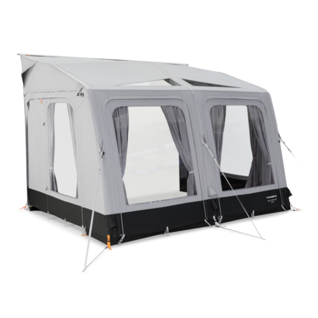 Dometics Rallt Air Tour 390 S är ett lättrest och flexibelt förtält med luftkanaler. Tältet är extremt lätt att montera och resa och kan tack vare dubbla kederlister monteras på både husvagn och låga husbilar. Fäst bara tältduken i listen på husvagnens markis, sätt fyra markpinnar i hörnen och pumpa upp de i tältduken integrerade kanalerna som bildar ramen från en ventil på tältet. Fäst sedan tätningen mot husvagnen och tältet är redo för inflyttning. Stora fönsterpaneler runt tältet och i taket ger bra ljus och en riktigt bra utsikt. Både front och sidopanelerna går att öppna upp tältet varma dagar.
