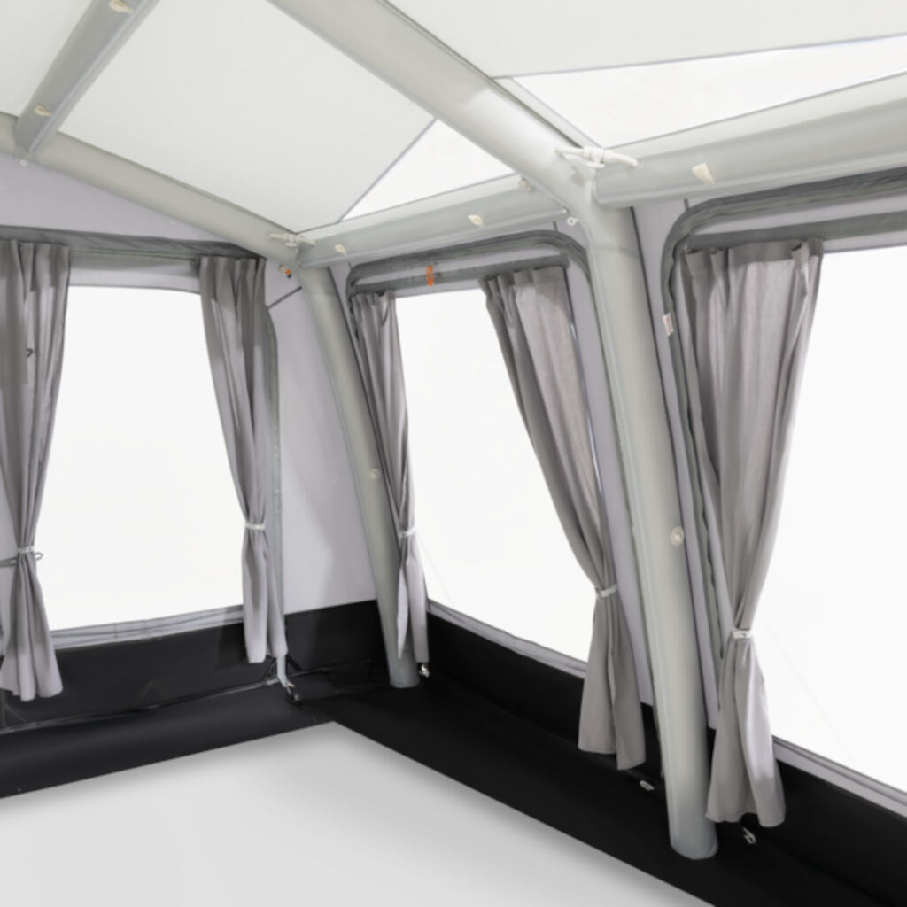 The Dometic Rally Air Tour 390 S is a very bright and pleasant inflatable awning with a depth of 250 cm. Angled air beams and large, openable window panels provide excellent comfort during your camping holiday or weekend trip. It’s also incredibly quick to pitch. Attach the awning fabric to the rail on your caravan or motorhome awning, inflate the integrated air beams, and secure the seal to the ground next to your vehicle — your awning is ready. Quick, easy and convenient.