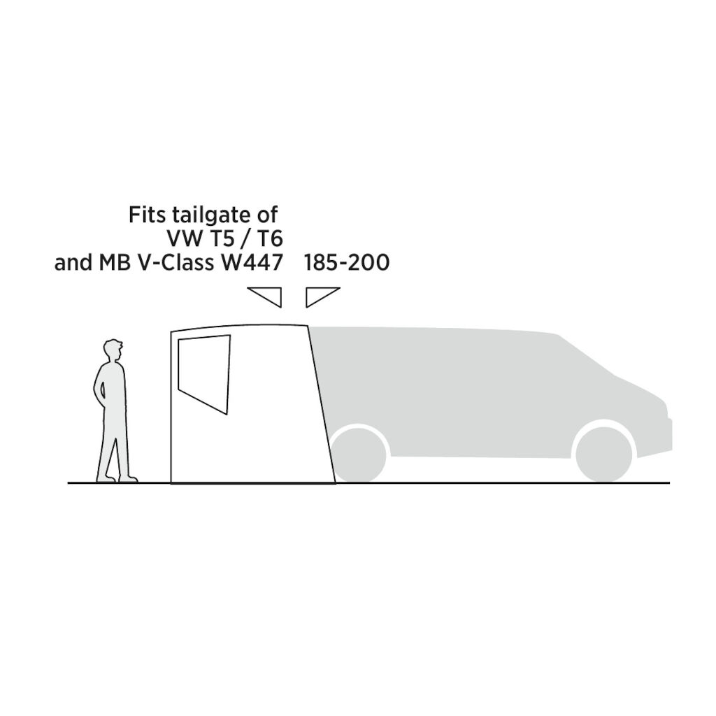 Easy Camp Krossbu is a car tent that attaches to the back of a campervan, creating extra sheltered space for cooking, storage, or relaxation. Fits VW T5/T6/T6.1, MB W639/W447, and similar vehicles. Easy setup with guy lines and the option to use the front door as a sun canopy with included poles.