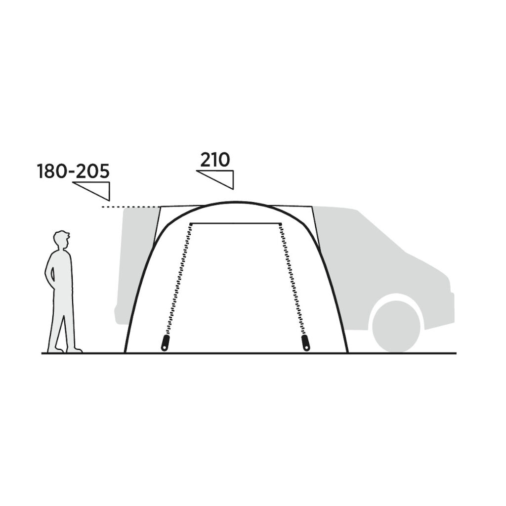 Quickly pitched car tent for minibus, car or smaller motorhomes. The tent is free standing with a connection to the car, which makes it possible to leave it at the campsite for day trips by car. The connection between the car and the tent seals against rain and wind and can also be closed completely against the tent. Fits vehicles with a height between 180 and 205 cm.