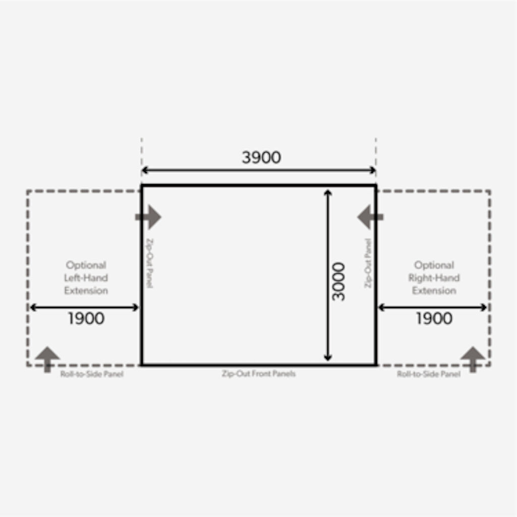 Caravan: The rail must have a straight section of 390 cm. If one side of the awning overlaps a window or hatch, it can be sealed using poles or limpets (not included).