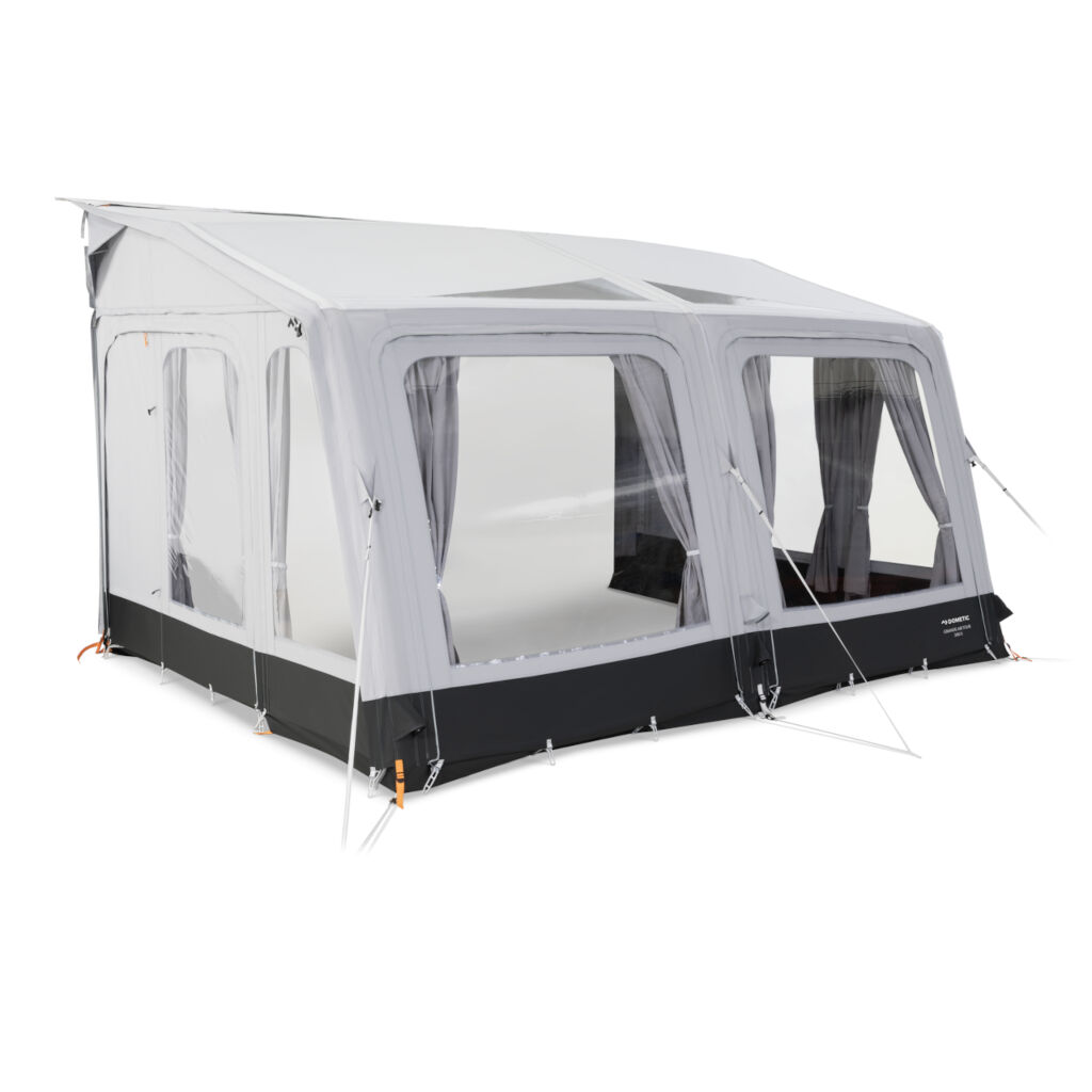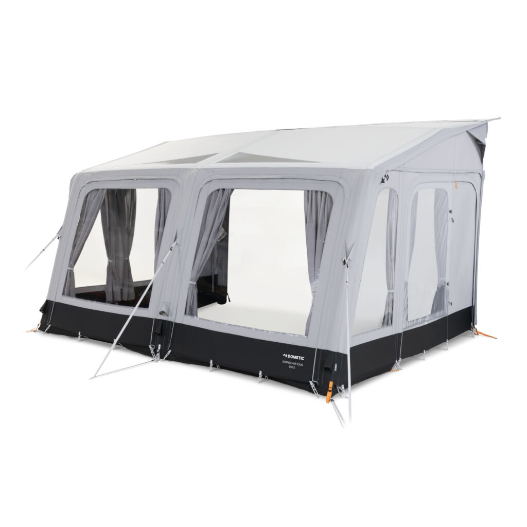 Dometic Grande Air Tour 390 (formerly Kampa Grande 390) is a very bright and spacious air awning with a depth of 300 cm. The depth in combination with angled air ducts and large windows provides fantastic comfort during the camping holiday. In addition, it is really fast to pitch. Attach the tent fabric to the tent rail on the caravan or to the rail on the motorhome awning, pump up the channels integrated in the tent fabric and attach the seal to the caravan / motorhome in the ground so the tent is ready. Quickly simple and convenient.