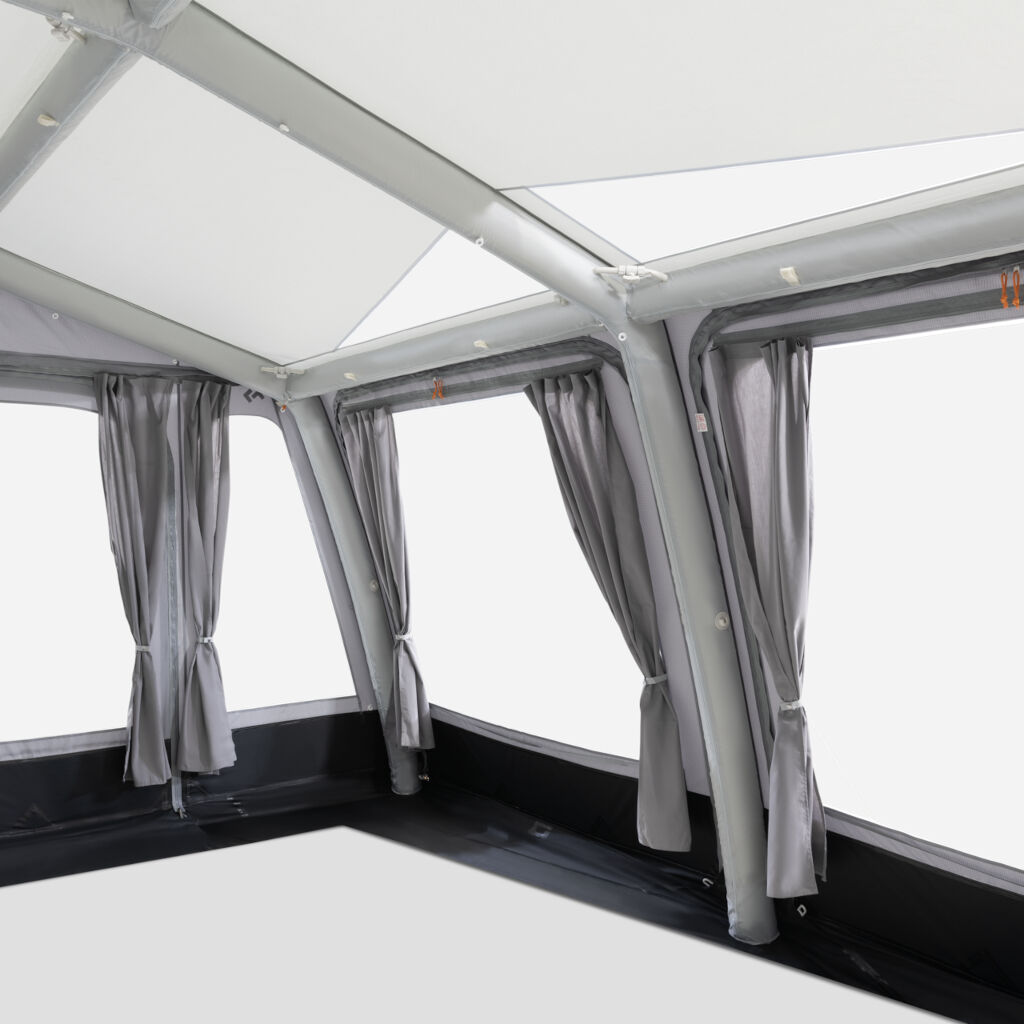 The Dometic Grande Air Tour 390 is a bright and spacious air awning. The awning is extremely easy to pitch and, thanks to its dual keder strips, can be mounted on both caravans and motorhomes. Simply attach the awning fabric to the rail on your caravan or motorhome's awning, peg the four corners, and inflate the integrated air tubes from a single valve. Then secure the draught skirt against the caravan and the awning is ready to move in. Large windows around the awning and in the roof provide excellent daylight and panoramic views. The front panels can be rolled to the side to open up the awning on warmer days.