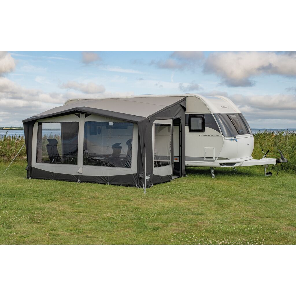 Telta Estate combines generous space with robust performance for long-term use. With a width of 390 cm and a depth of 2.75 m, you get a spacious and comfortable awning, perfect for both short trips and full-season stays. The exclusive SolTex fabric provides excellent protection against the elements while remaining breathable and performing optimally year-round. Designed for caravans, motorhomes and high campervans – an awning that delivers comfort, durability and style in every situation.