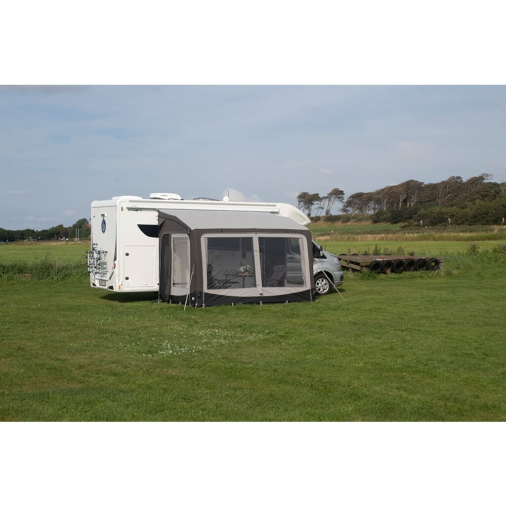 Pure 330 from Telta is a very bright and pleasant air awning for both caravans and mobile homes. The large window panel in the front can be both detached or rolled up to use the tent as a sun roof during the day and then if it gets colder assembled again. A stronger fabric that breathes provides both a better climate in the tent and a longer lifespan. Plus, it's really fast travel. Attach the tent fabric to the tent rail on the caravan or to the rail on the awning of the mobile home, pump up the channels integrated in the tent fabric from a valve and attach the seal to the caravan/motorhome in the ground and the tent is ready. Fast, easy and convenient.