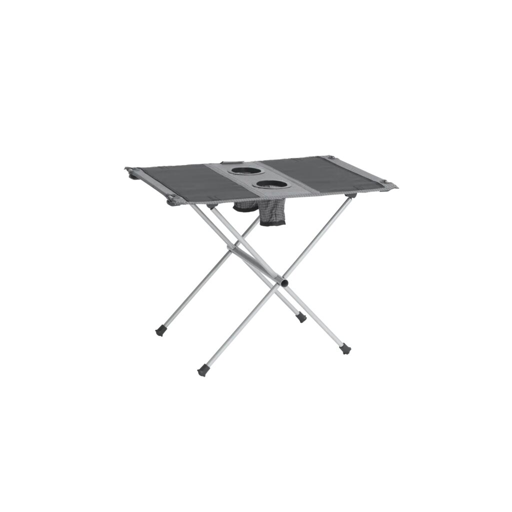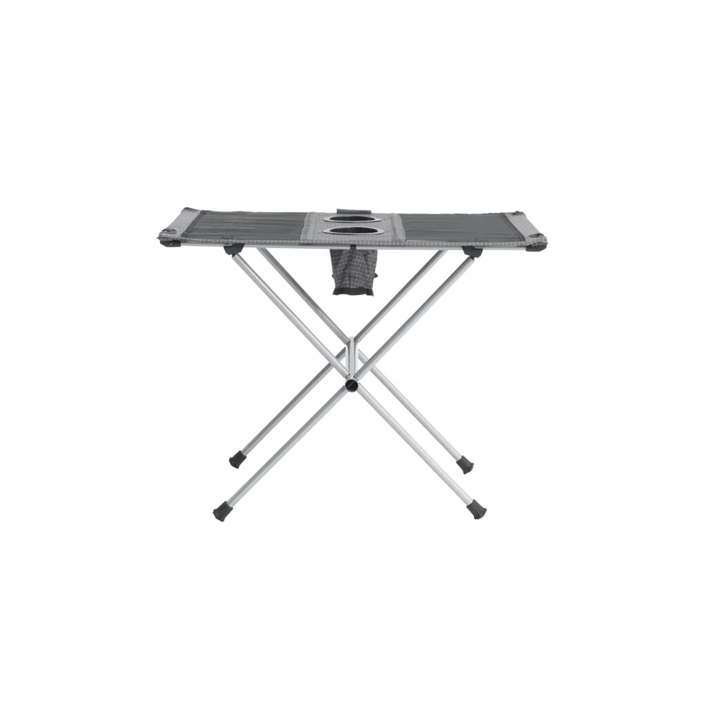 Small and low table with a steel frame and cup holders for two people. Compact pack size and easy to fold and pack into the included carry bag.