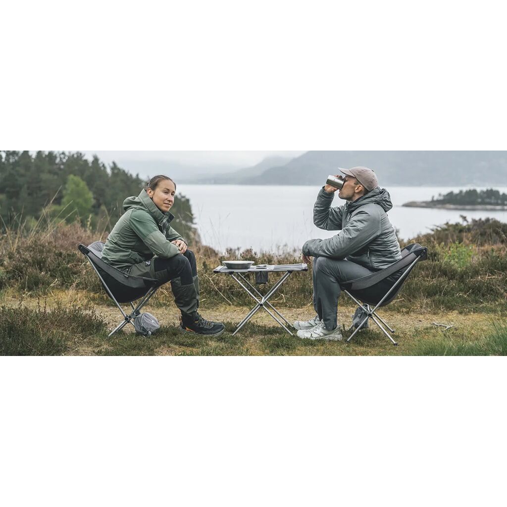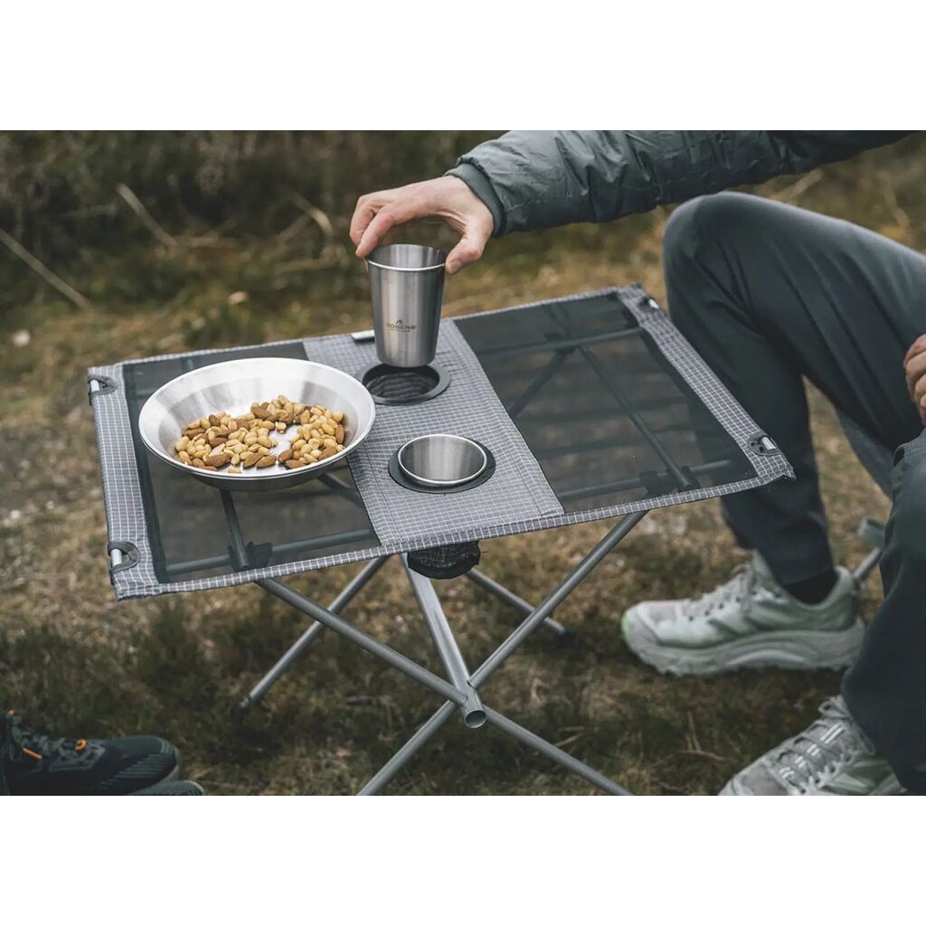 Small and low table with a steel frame and cup holders for two people. Perfect for a small tent, day trips, the beach or picnics, as it also works well to sit on the ground and eat at the table. Compact pack size and easy to fold and pack into the included carry bag.