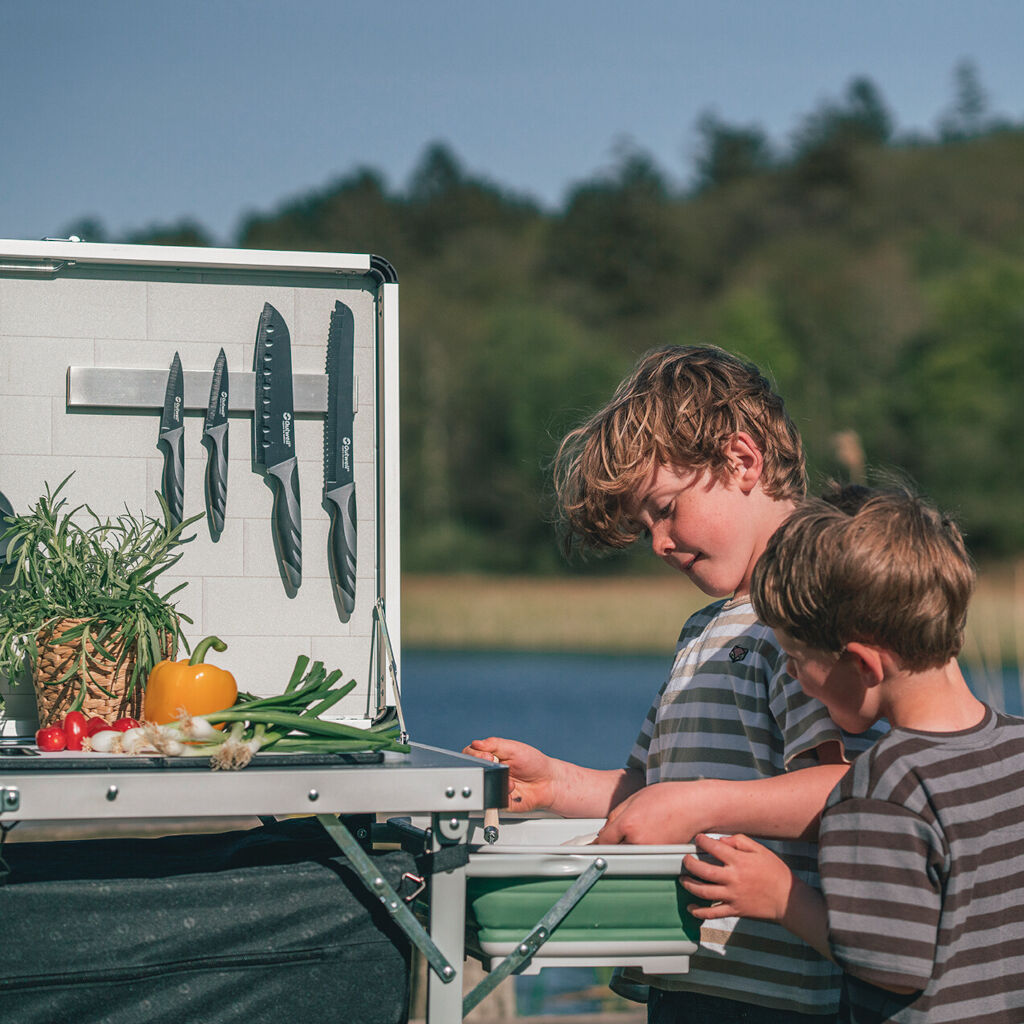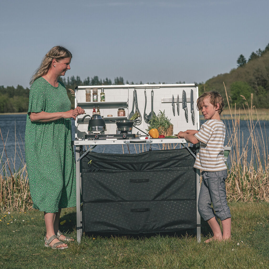 Smart and quickly assembled kitchen bench with very good storage options for all kitchen needs at the campsite. Robust tabletop where a lid is flipped up to create a windbreak for the bench, which also has a removable washing bowl. The top provides ample space for cooking, and the two larger cabinets hold kitchen equipment and pantry items.
