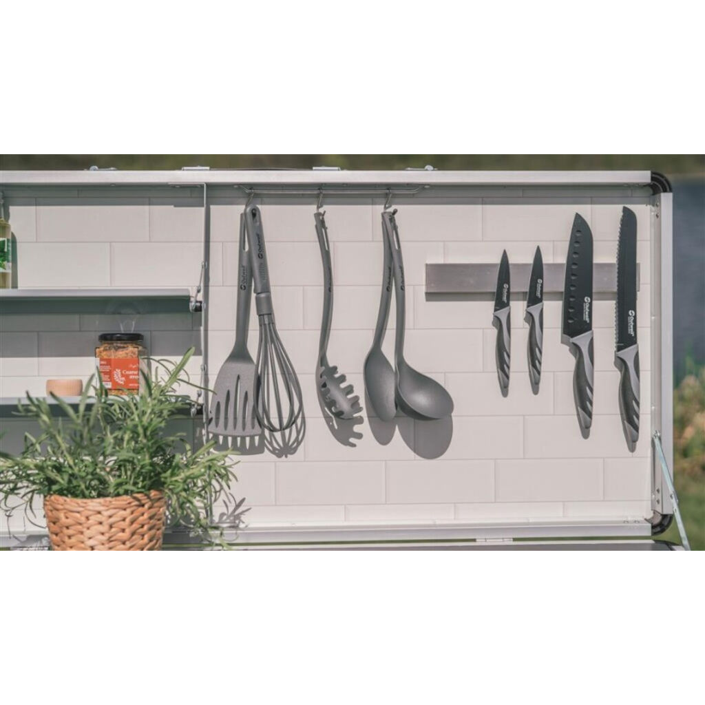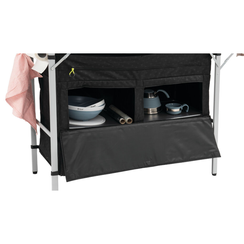 Kitchen bench with a wind-protected work surface, space for a stove, and a removable washing bowl, along with several good storage options, makes Magante a perfect choice for campers who want to manage storage and cooking in one place. The kitchen bench offers well-thought-out storage solutions including two large storage cabinets with magnetic doors, a lower mesh shelf with a zipper, and a magnetic knife holder. The Outwell Magante Kitchen Table is easy to assemble thanks to foldable legs and has a very small pack size when folded.