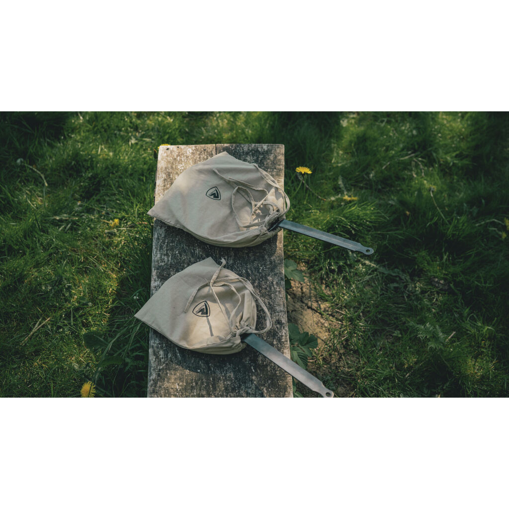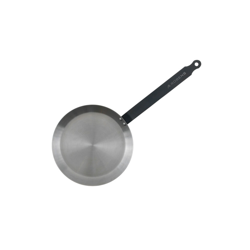 Tin frying pan from Robens with extra long handle and without wooden details, perfect for cooking over fire or in the oven. Tin frying pans darken with use and time.