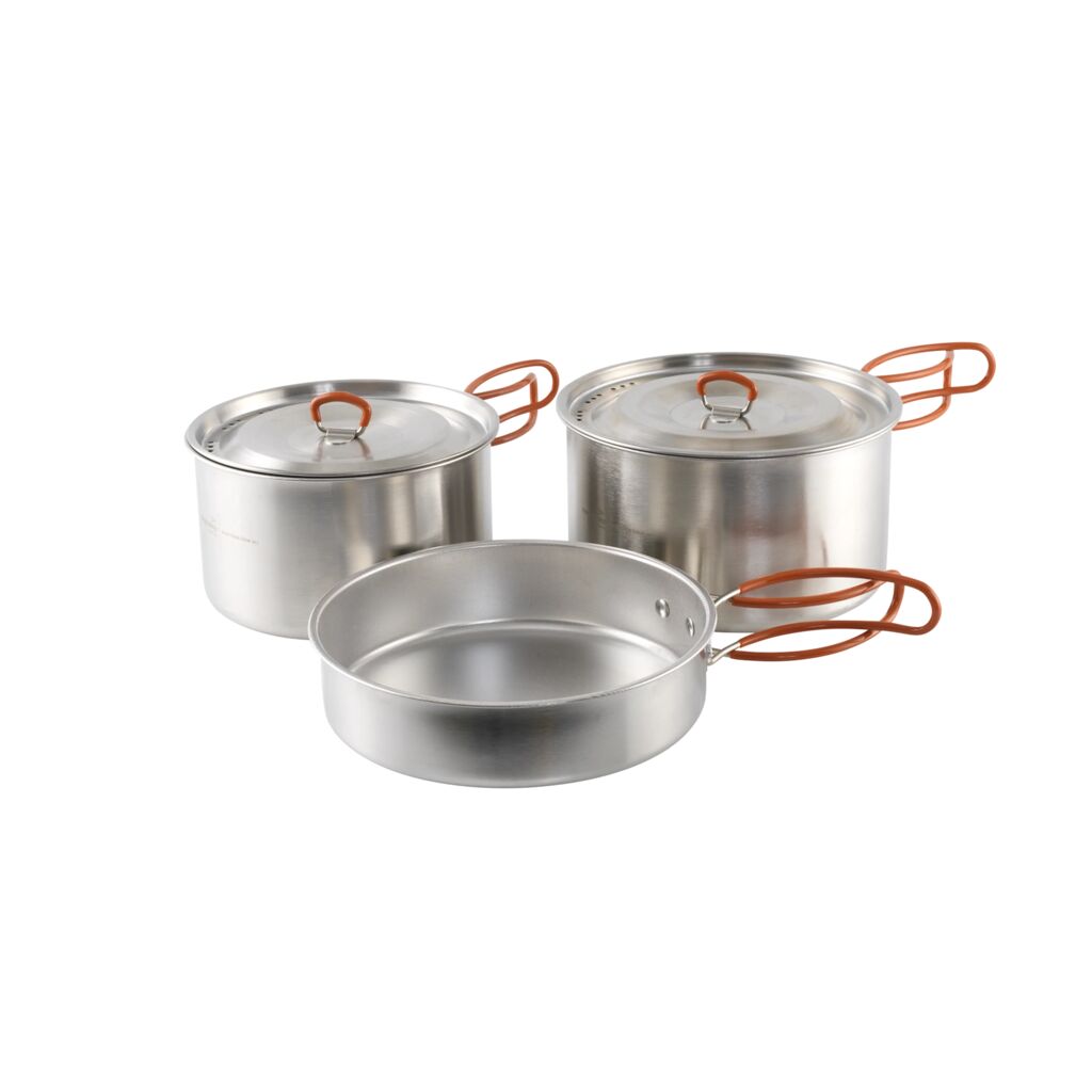 Stackable stainless steel cook set from Easy Camp, consisting of two pots (2 and 3 litres) with lids and a frying pan.