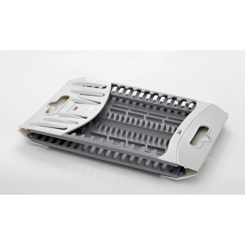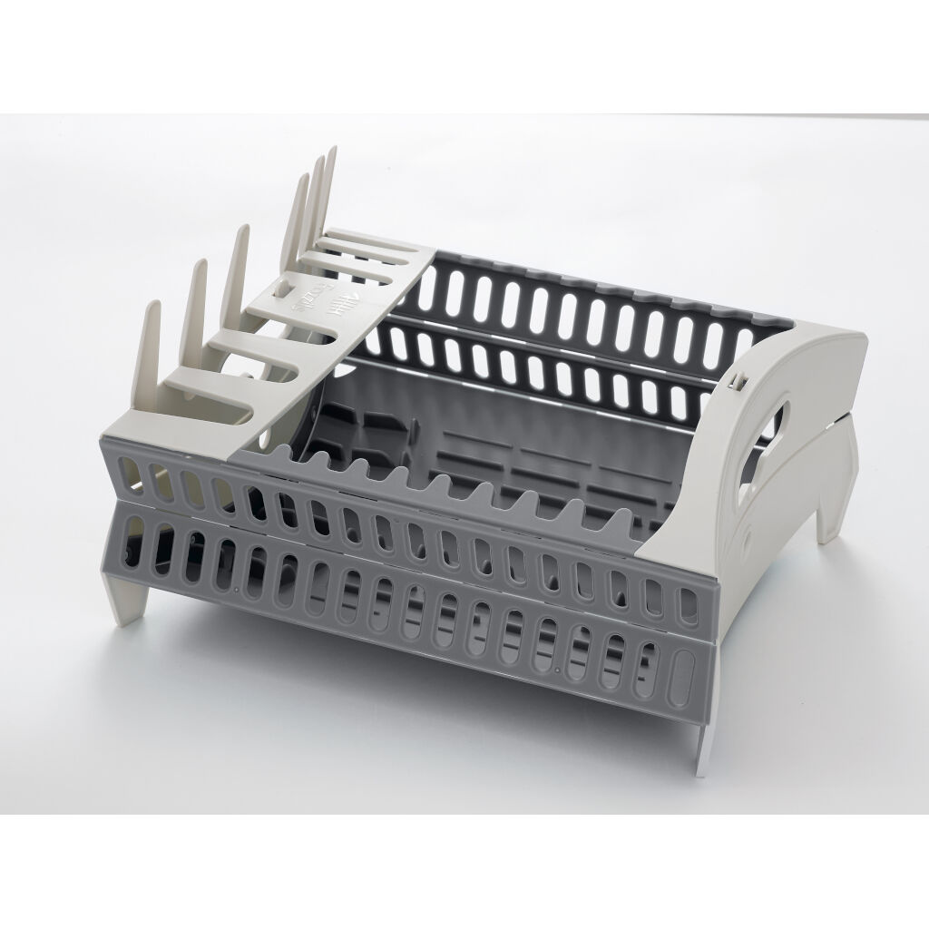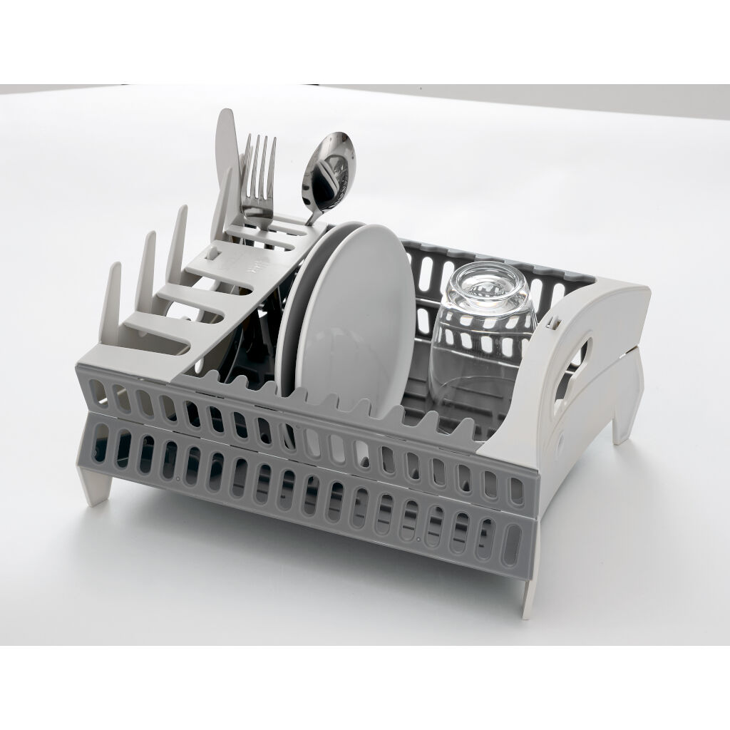 Foldable dish rack from Isabella with plate holders and space for multiple utensils. Easily folds into a compact pack size.
