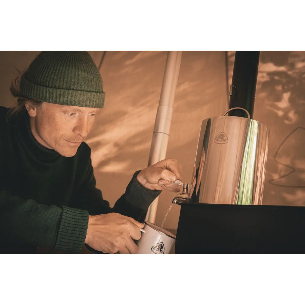Water heater with tap for tent stoves. Attached around the stove pipe.