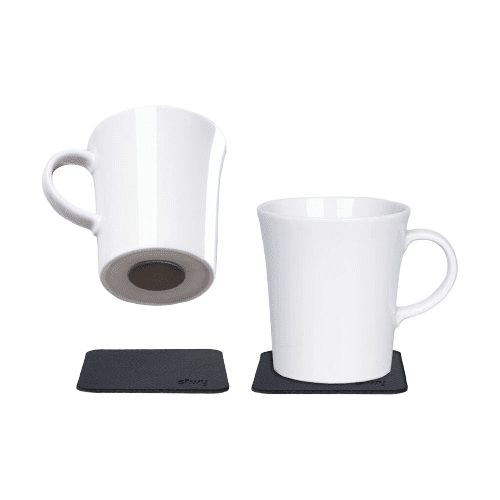 German-made porcelain coffee cup with a strong magnet on the bottom that keeps the mug in place during transport. A really smart solution that prevents the cups from sliding or rattling during transport. Two black magnetic mounting plates are included with nano gel pad which you can stick on any surface to keep the cups in place. The mounting plates consist of a rubber surface and a sticky underside that can be attached to any surface without leaving residues. If the adhesive loses its ability, it can be reactivated by rinsing in water.