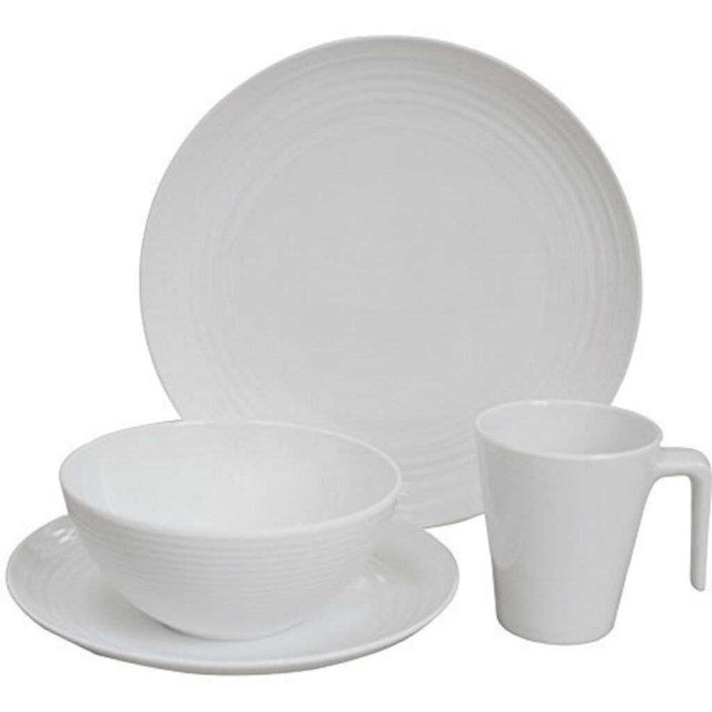 Campingservis i 16 delar för fyra personer i en kraftigare melamin. Melamin är tåligt och lättskött och passar bra till campingturen eller picknicken.