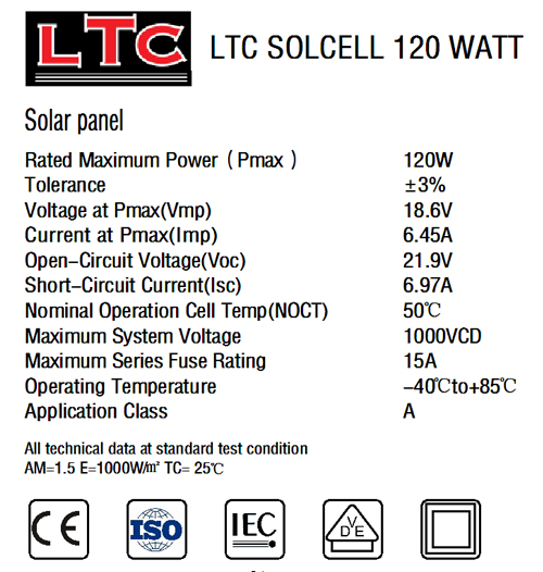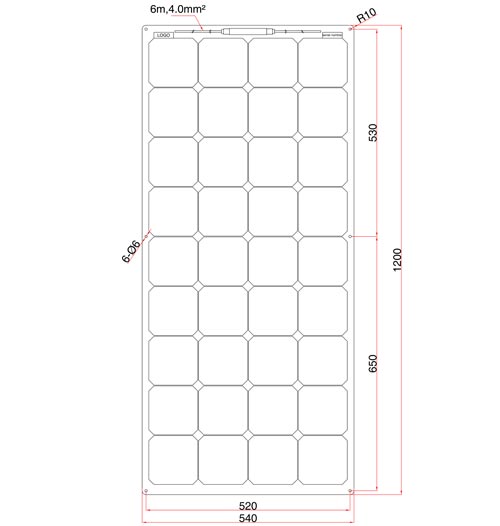 A flexible 120W solar panel from LTC. 30% higher efficiency compared to conventional solar panels. The solar cell has a power guarantee of 90% for the first 10 years and then at least 80% for 25 years. The solar cell consists of monocrystalline, which results in a higher efficiency in comparison with polycrystalline solar cells.
