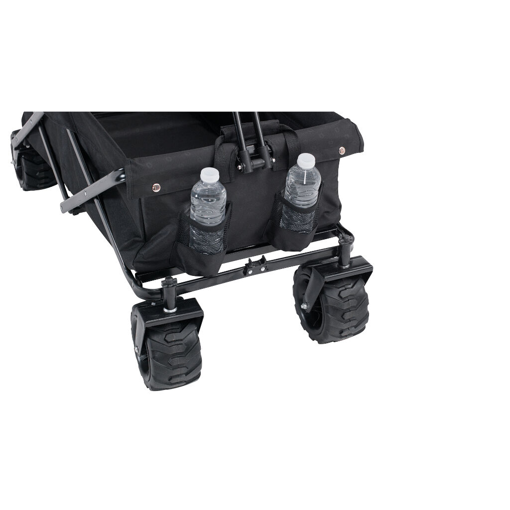 Transport trailer with longer handles and extra large wheels. The wide tires mean that it also works on sand. Perfect for camping equipment, for visiting the beach or to give the children a rest while on the excursion. Folds easily for transport and storage.