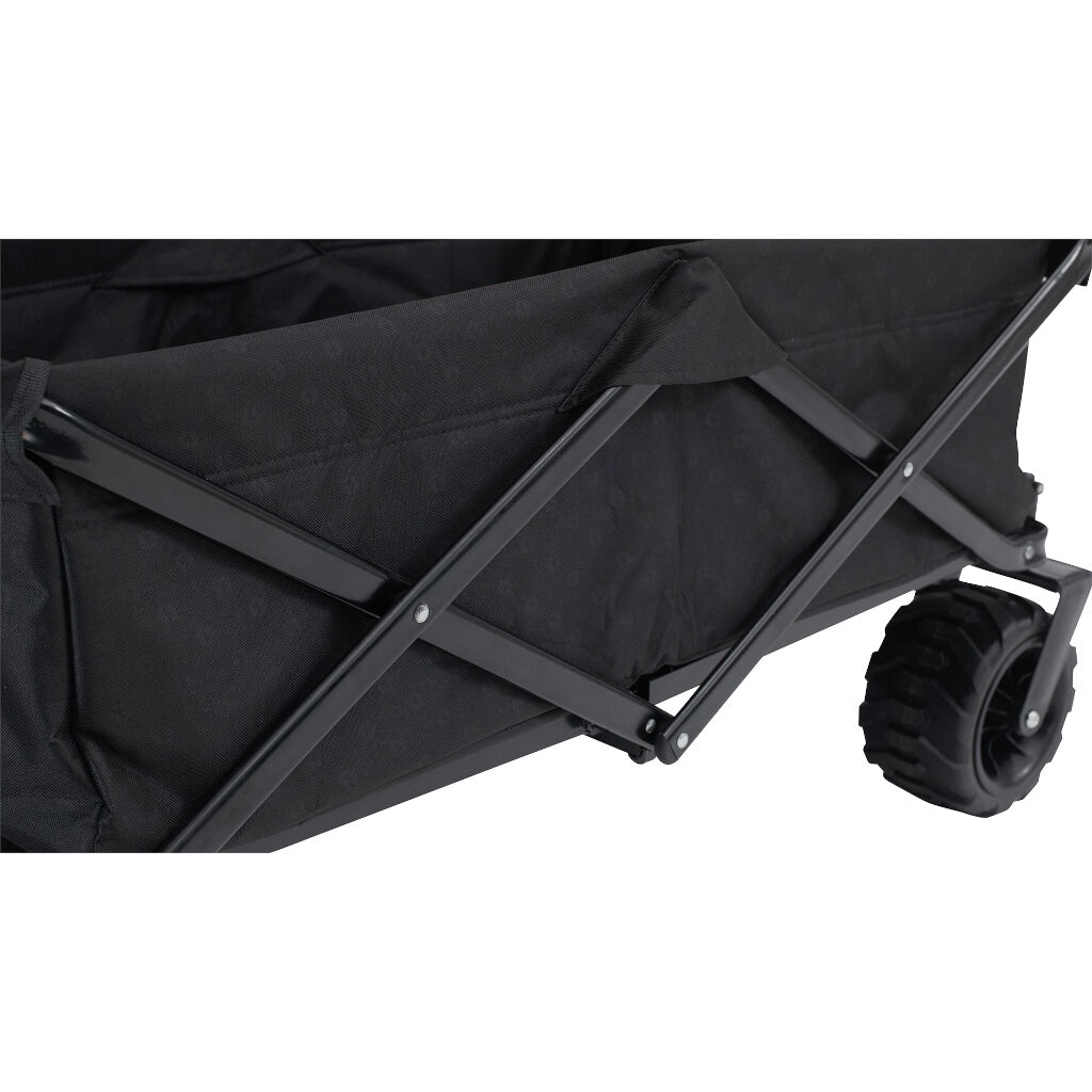 Foldable transport trolley with long handle and extra large puncture-free rubber tires that also work on sand. Perfect for the trip to the beach, to take the children on the day trip or to move your camping equipment.