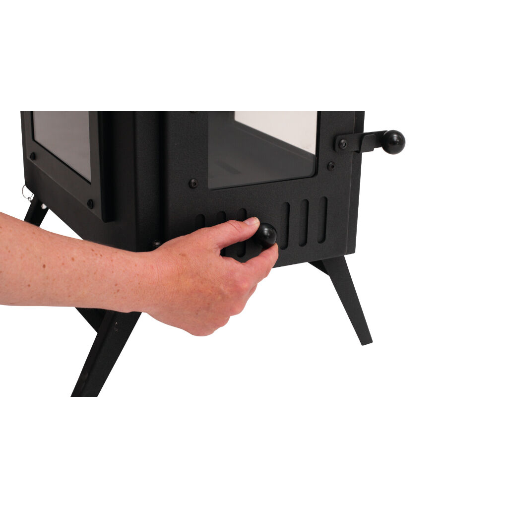 An easily mounted tent stove that can be used in most tents prepared for a stove. A completely airtight door and a large damper provide good control of the fire. A drying rack and a cooking plate make it versatile in its use. Sturdier German-made stove glass on three sides offers a nice ambiance in the tent while making it easy to inspect the fire.