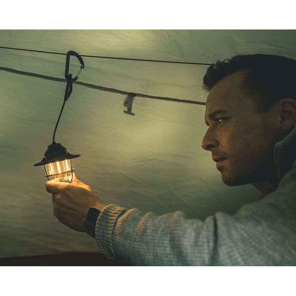 Compact and practical camping lamp in classic design with modern features. The lamp has a rechargeable battery, dimmer function, and several color modes. Comes with a carabiner for easy hanging and charging cable (USB-C).