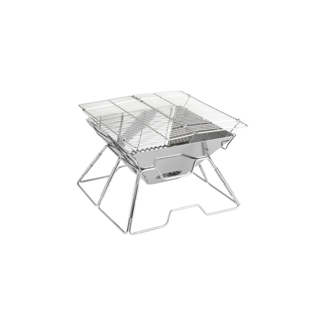 Foldable mini grill with compact pack size and good depth, providing plenty of space for charcoal or wood. The grill is easy to fold out and in and easy to carry using the built-in handle.