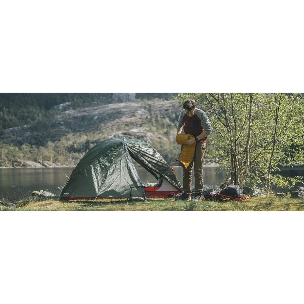The shape of the Robens Air Impact provides space where the body needs it, meaning the sleeping mat is wider across the chest and narrower towards the legs. A lightweight ripstop polyester surface keeps the weight down while offering good durability. The top surface also features an anti-slip finish that keeps your sleeping bag in place during the night. The Robens Peak Valve offers excellent airflow and a non-return valve that makes it easy to pump or blow in extra air for a firmer feel.