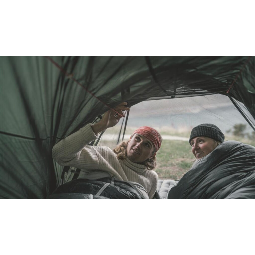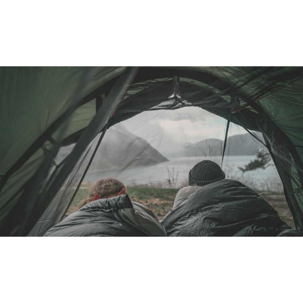 Robens Serac 600 is a down sleeping bag mainly for the winter but which is also suitable for late autumn and early spring. The hood is anatomically shaped and closes really well around the head when you tighten. Thanks to two controls for the upper and lower part, it is possible to minimise the heat loss from the head. A good detail is that the sliders sit on the outside of the sleeping bag, which provides better comfort when they are tightened. In addition, there is an adjustable heating collar that prevents the heat from escaping around the neck. The hood's straps are in different materials, which makes it easy to adjust even in the dark. The zip is also protected with an folded-over edge that prevents heat leakage. The zip can also be opened from below to get good ventilation on hot nights and also has an autostop that prevents it from going up during the night if you have opened it partially for ventilation.
