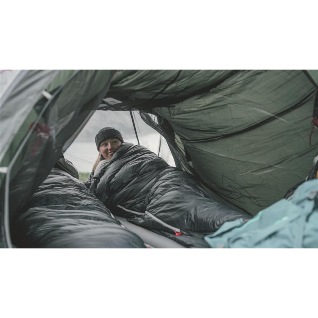 Very reliable winter sleeping bag with a slightly wider fit that provides better sleeping comfort. A smart construction on the hood minimises heat loss during really chilly nights. Duck down provides good insulation for its pack size of only 30 x 21 cm. The sleeping bag can handle very cold nights and is suitable all winter.