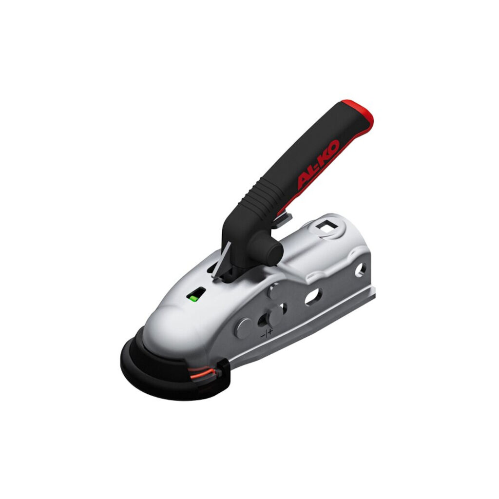 The AK 161 is designed for braked trailers up to 1600 kg and features a visual open indicator and a safety mechanism that prevents false locking. This mechanism, an internal green lever, is only activated when the coupling is properly mounted, ensuring reliable locking.