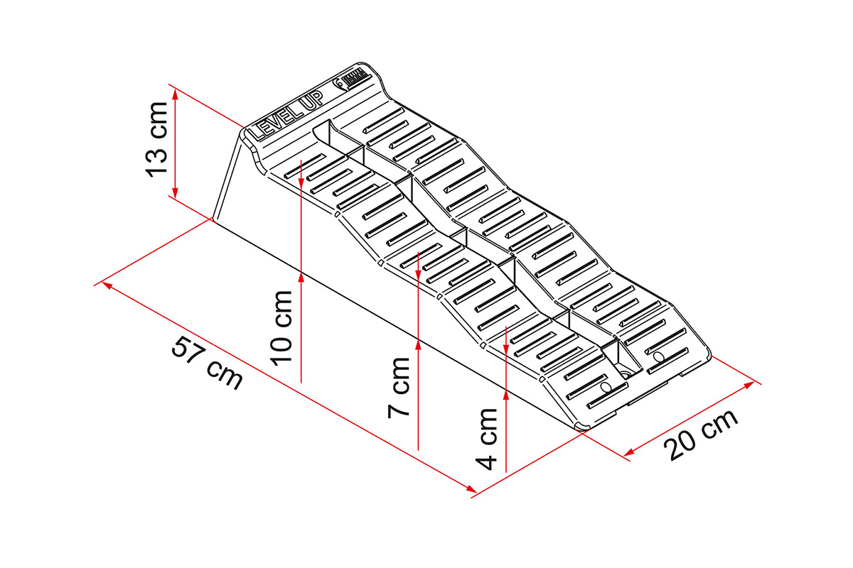 Driving blocks/level wedges from Fiamma with three levels that can handle a total load of 5 tons (with two blocks). With a grip-friendly surface and three levels of 4, 7 and 10 cm, it will be easy to get your motorhome to stand straight. Bag included.