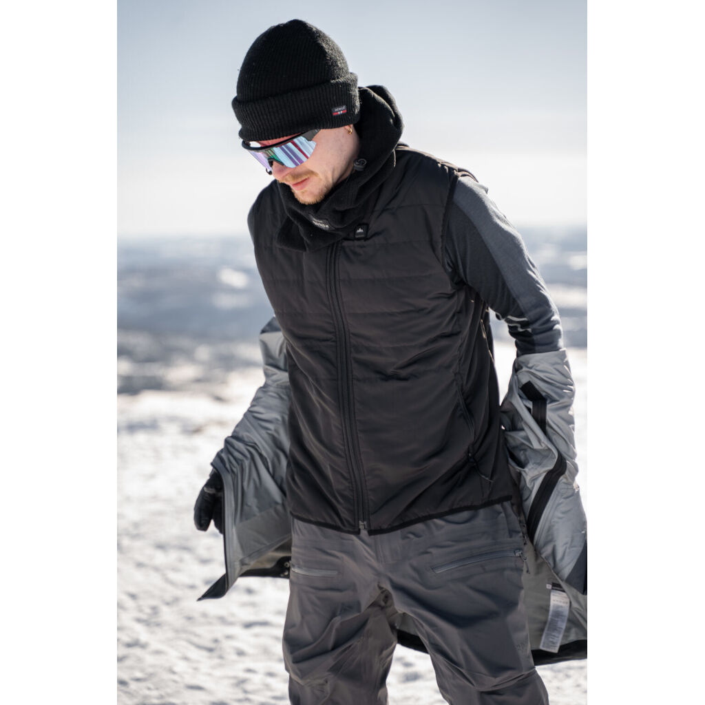 Battery-heated vest for cold days. With heating panels on the chest and lower back, you can easily maintain an even and comfortable body temperature. The 80-gram synthetic insulation retains warmth close to the body without compromising mobility. Perfect for those who want to stay warm and maintain full freedom of movement in cold environments.