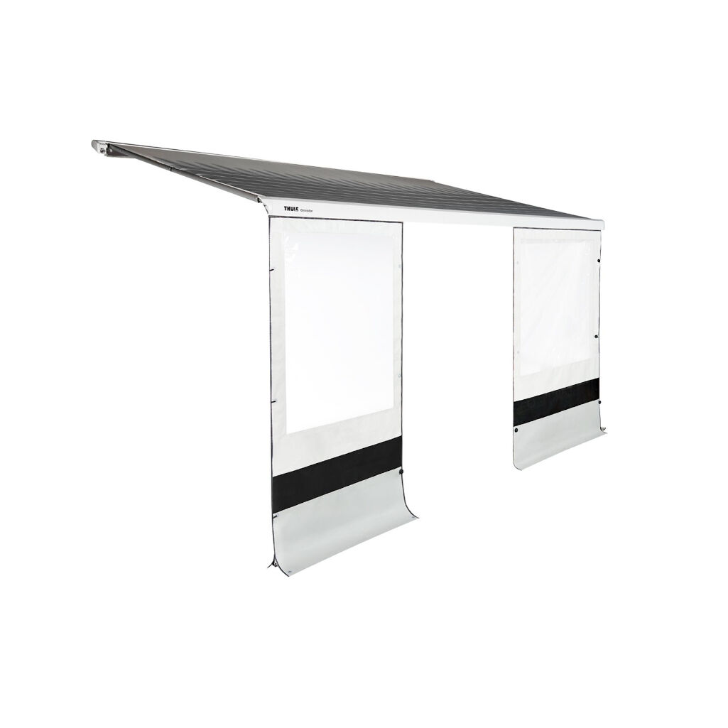 Front sections with windows for your Thule awning. Protects against both wind and rain. Mounts easily in the groove on the awning. The front section can be rolled up and attached to the awning when not in use.