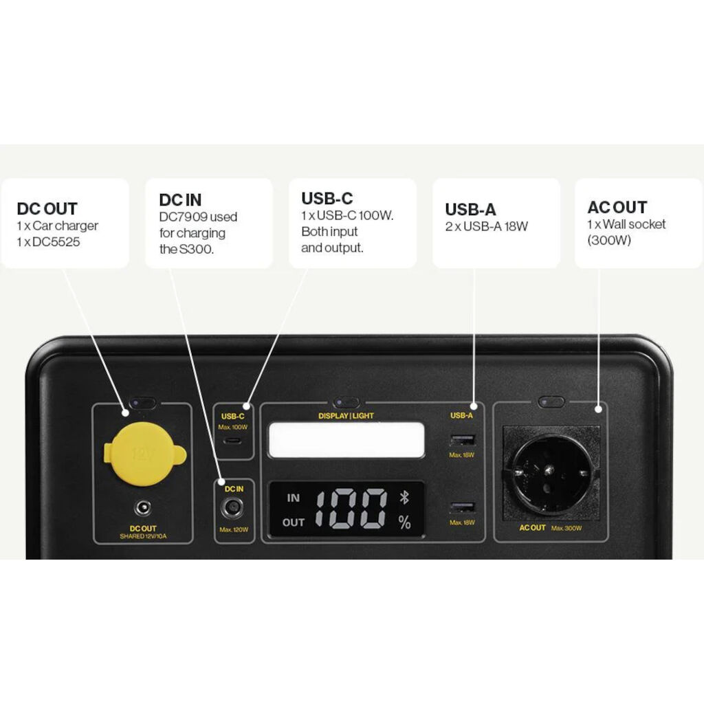 | Connection | Out: 1 x 230V (300W continuous, 500W starting current) 2 x USB (18W) 1 x USB-C (100W) 1 x 12V car socket (max 100W) In:1 x XT60 Solar Panel 1 x Car Charging 1 x USB-C |