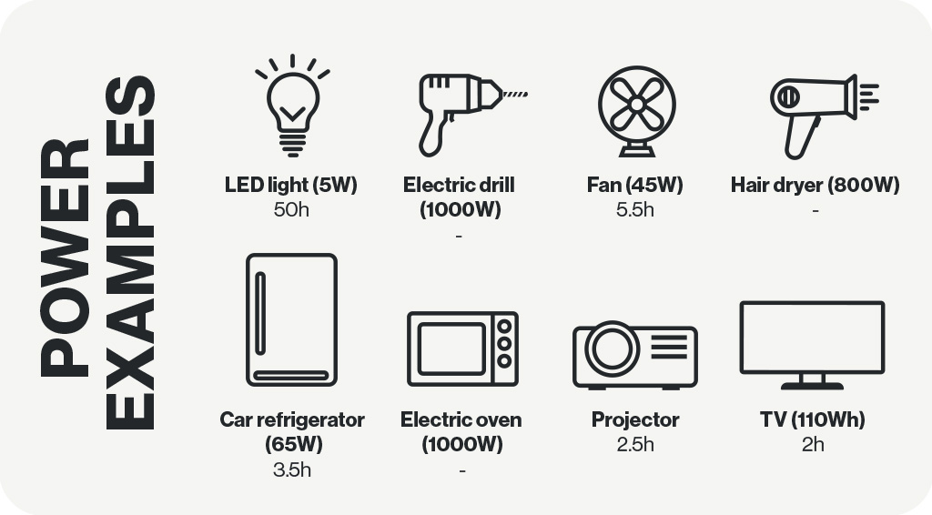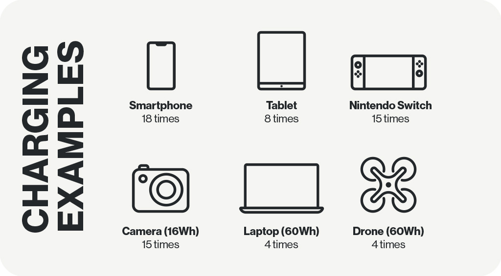 - Charge or power electronics via a regular outlet, USB-C, USB, 12V (cable for Solar Panel not included, available as an accessory)