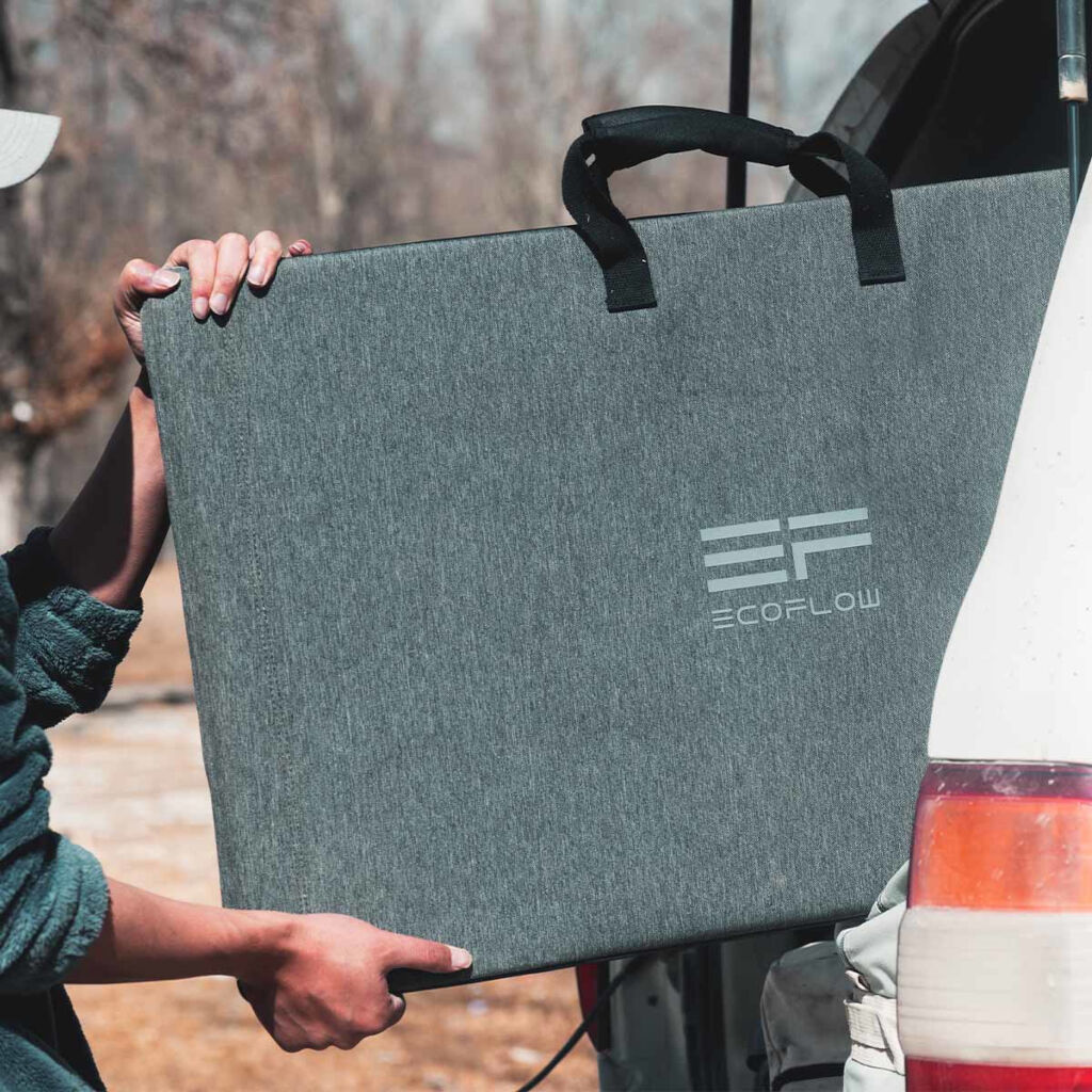 Innovative large solar panel from EcoFlow that also has solar cells on the back that capture reflective sunlight, which provides a more efficient charge without affecting the size. Solar cell technology that provides good charging even in bad weather (15-30W in cloudy weather). Rainproof bag with zipper that also functions as a stand provides both good protection and easy handling. Durable panel and waterproof connectors allow the panel to stand outside in the rain and even stay in water for up to 30 minutes.