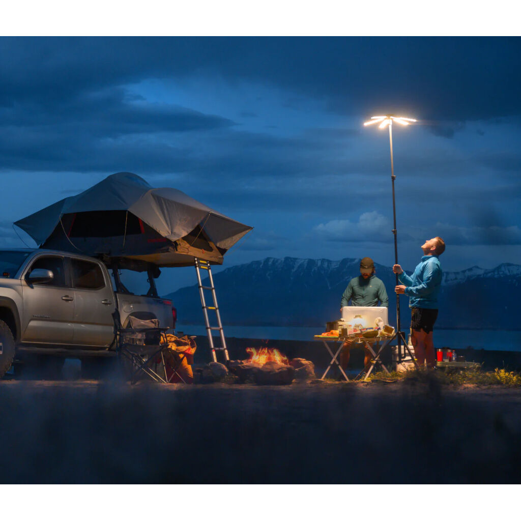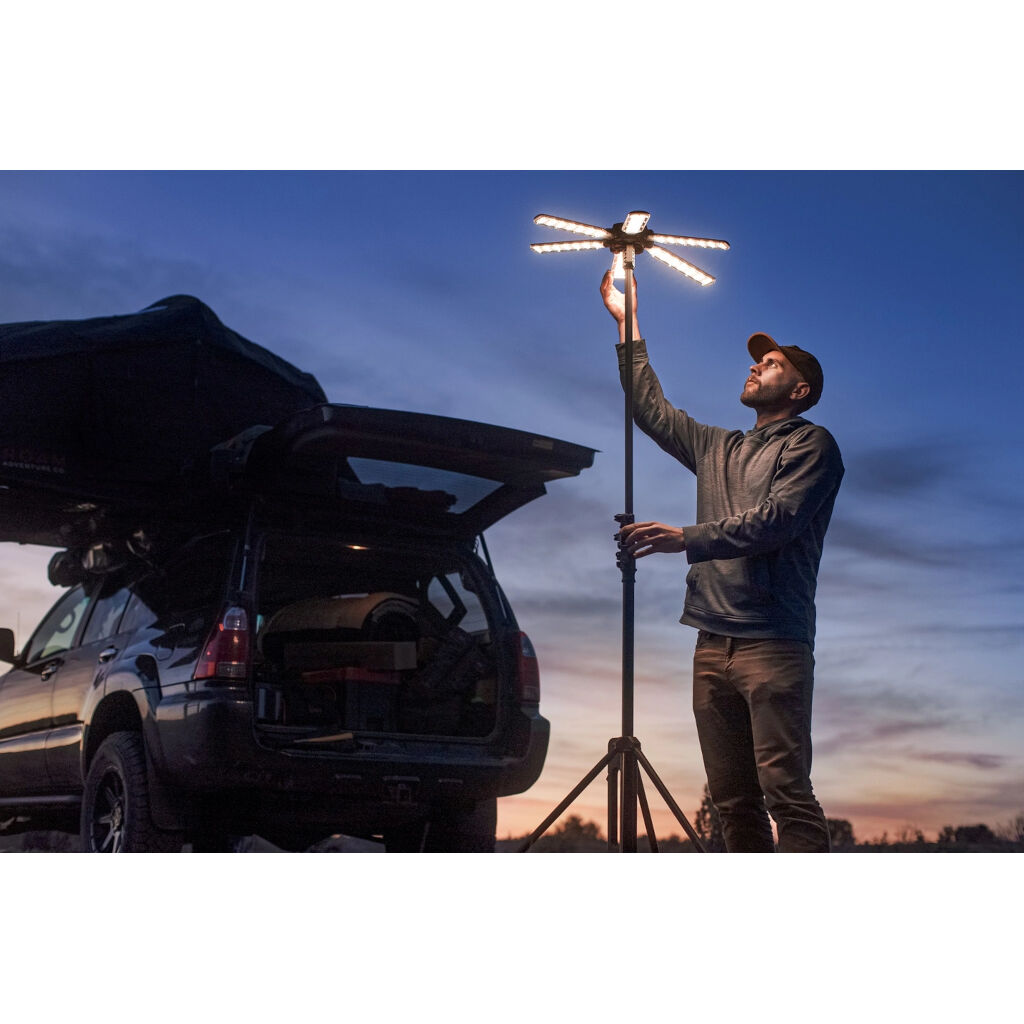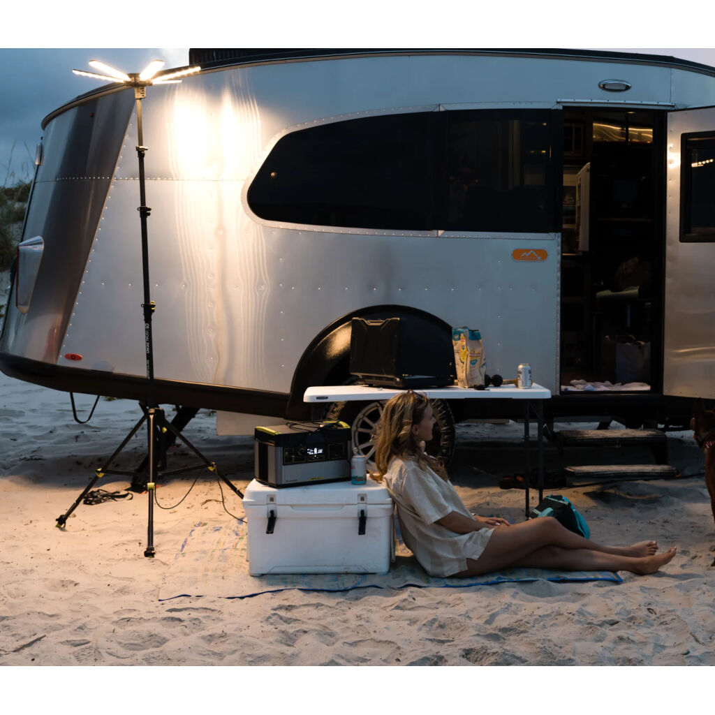 Smart portable outdoor lighting that is perfect for the camping trip or base camp. Thanks to a lightweight telescopic stand with a maximum height of 3.6 meters and adjustable lamps, it can illuminate up to 90 meters, allowing you to have excellent outdoor lighting even when it's really dark. The capacity of the lamps is 6,000 lumens, providing you with significantly better visibility than a regular camping lamp. It has a built-in battery but works best with a Power Station or with a 12V source to plug it into.
