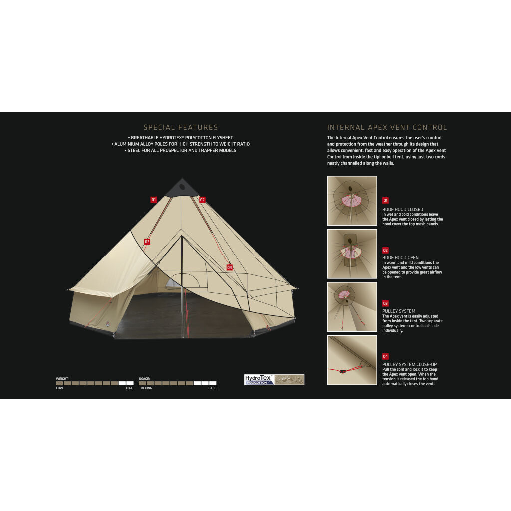 | Flysheet | HydroTex Polycotton, 65% polyester / 35% cotton. 210 g/m² |