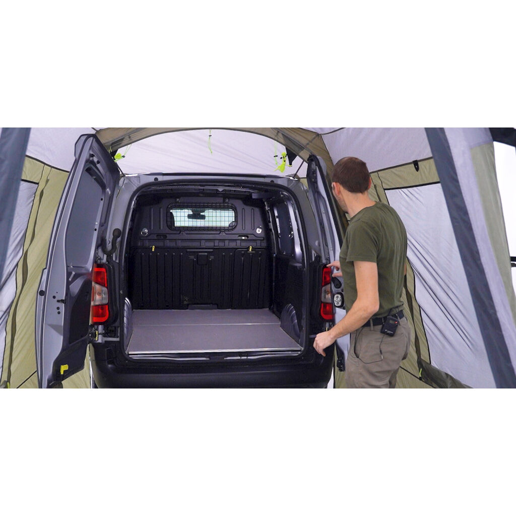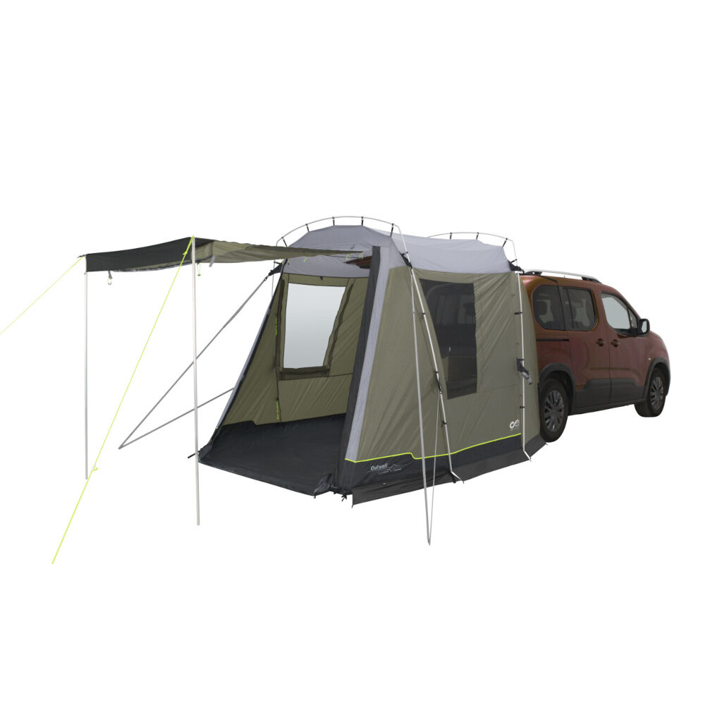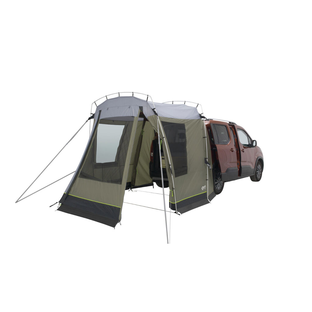 The Outwell Dunecrest S is a freestanding tent that is placed against the campervan's or car's tailgate. Perfect for creating an extra space for cooking, equipment, or for sitting in during bad weather. The tent is pack-friendly and, thanks to a durable fabric and aluminum poles, very robust. The attachment to the vehicle is tightened to the vehicle's rear doors, against the rear tires, and with adjustable ground mounts. The tent is developed for Peugeot Rifter, Citroën Berlingo, VW Caddy, and similar vehicles with a height between 170 and 185 cm.
