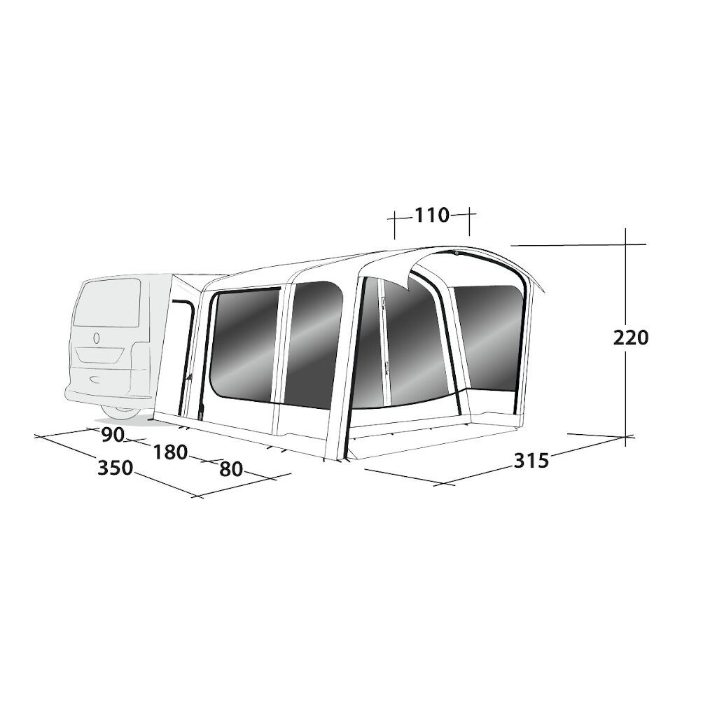 Outwel Maryville 260SA är ett biltält med luftkanaler från Danska Outwell. Tältet är extremt lätt att montera och resa och passar de flesta bilar med en höjd upp till 200 cm till listen eller taket. Fäst bara tältduken i marken med slussen mot bilen, pumpa upp de i tältduken integrerade kanalerna som bildar ramen på tältet. Fäst sedan tältet via kederlisten på bilen/markisen, mot räcket eller över bilen.Enda stången är den som sitter över skyddet vid öppningen framtill. Speciellt med detta tält är att den stora ingången kan flyttas fram för att skapa ett skyddat uterum om så önskas, perfekt vid sämre väder.