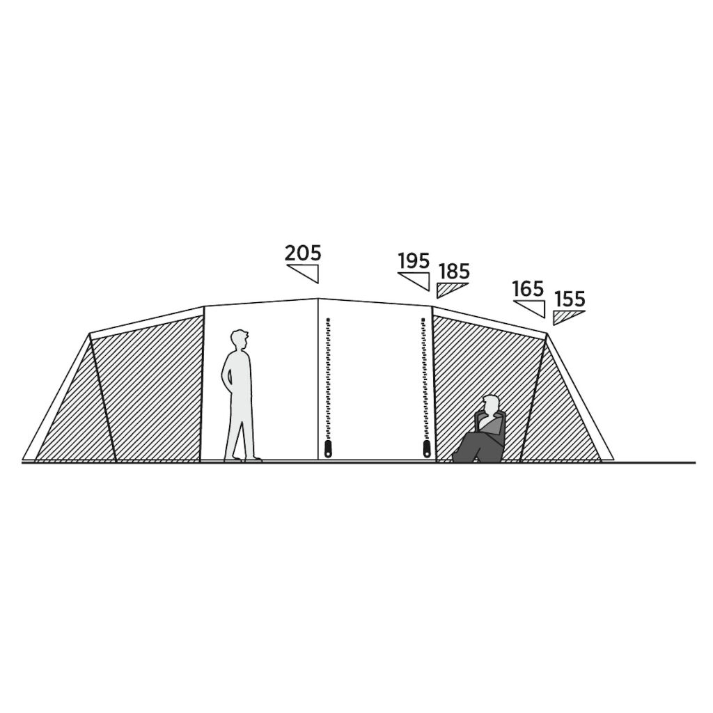 The tent has 4 sleeping compartments, arranged in a vis-a-vis design with 2 on one side and 2 on the other. The sleeping compartments are spacious and can be divided with zippered partitions. Dark walls and ceilings protect against morning sun and ensure better sleep – an extra advantage for families with children.