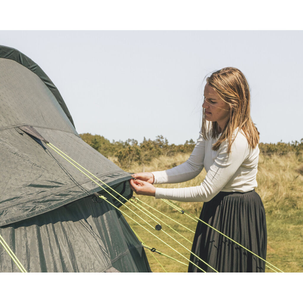 Outwell Carolina 6 is a tunnel tent with three bedrooms and a spacious living area, suitable for groups of up to six people. However, we also recommend it for families of four or five to enjoy extra space in the sleeping cabins. The tent has a sewn-in groundsheet throughout, protecting against wind, insects, and moisture. Combined with the large windows in the living area, it creates a bright and comfortable indoor climate—especi
