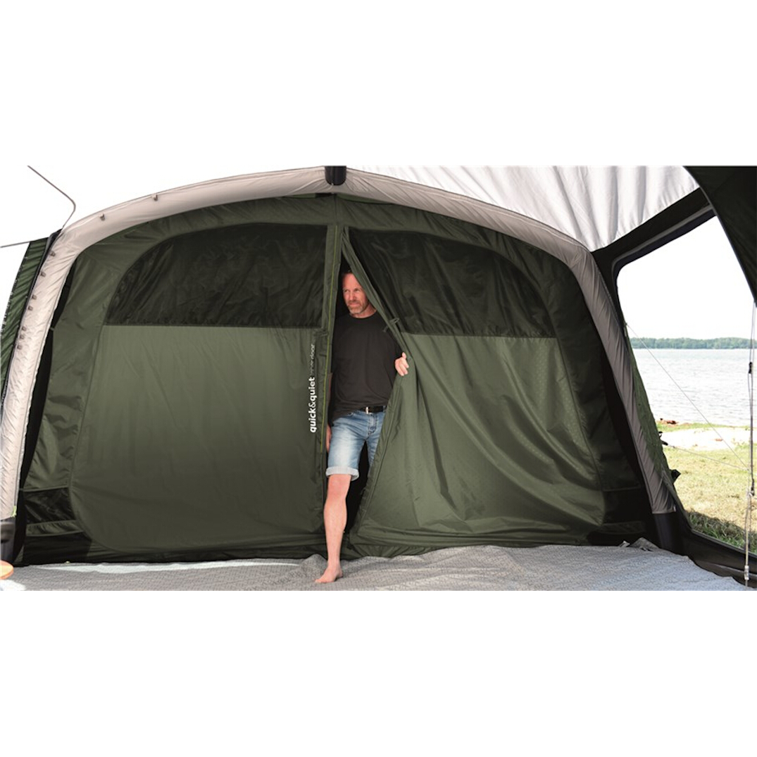 - Outwell Quick & Quiet Inner door The door between the living area and the outer room and the door to one of the sleeping areas has a magnetic strip in addition to the zip so it can be opened and closed without a zip.