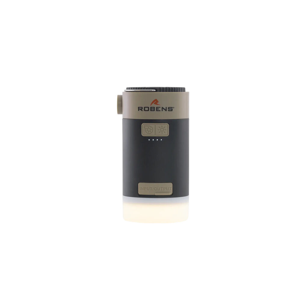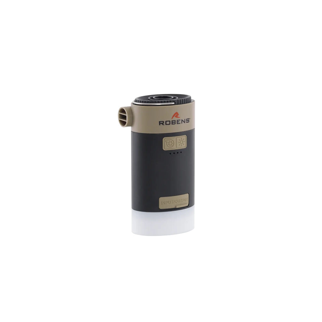 Compact and durable battery-powered mattress pump that also functions as a lamp and power bank. The pump can be charged via USB-C or the built-in solar panel. Perfect for inflating sleeping pads, air mattresses, or inflatable furniture. Comes with 5 nozzles and an adapter for Robens sleeping pads and Outwell's FHF valves. A built-in hook also allows the lamp to be hung from the tent ceiling.