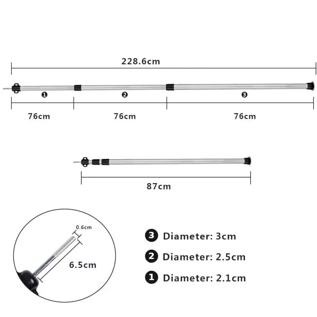 Package of two aluminum telescopic tarp poles in a bag for transport and storage. The bar is in three sections and can be adjusted in length between 93 and 230 cm.