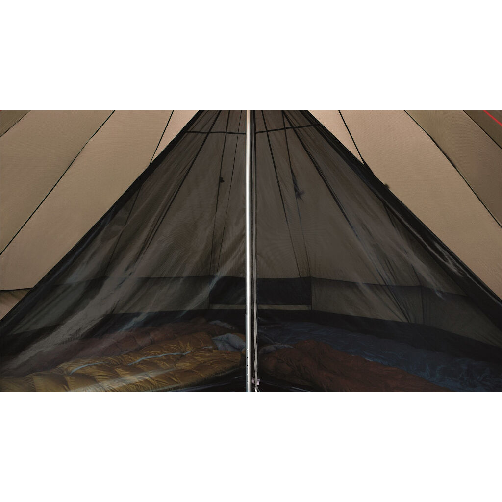 Universal inner tent/mosquito net for four people intended for tipi tents. The inner tent has no floor and comes with adjustable straps for connecting Roben's different tipi tents.
