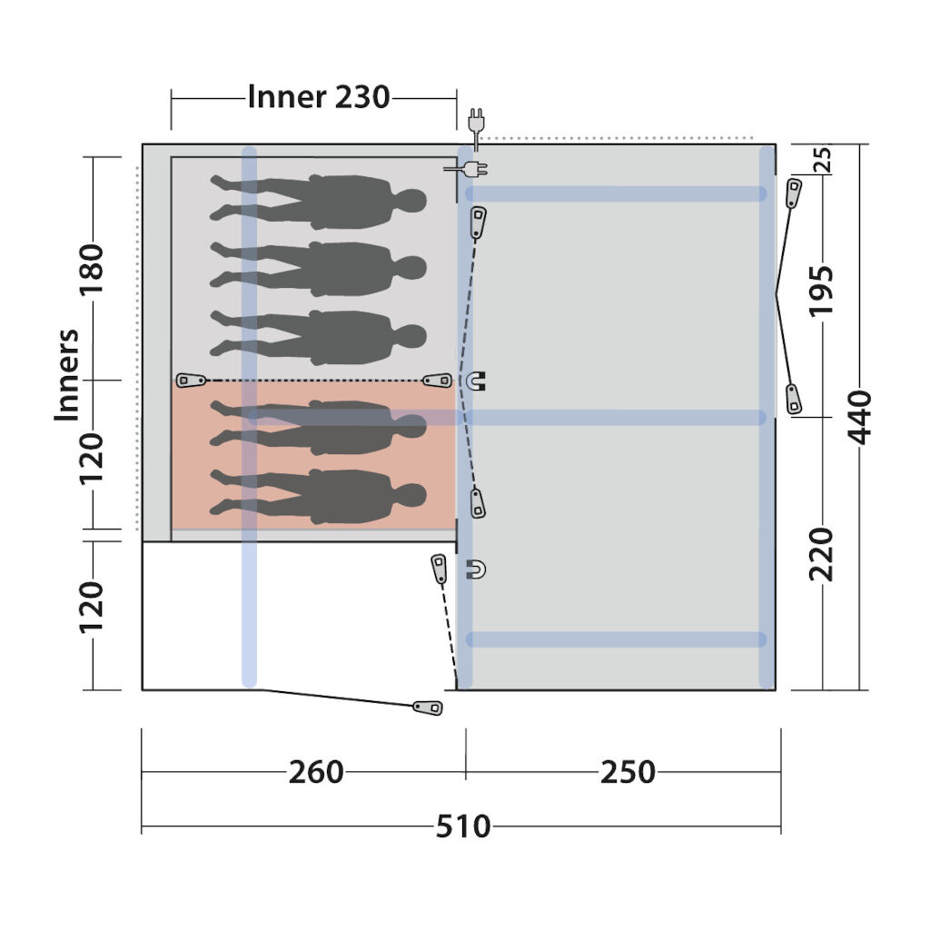 A practical storage area next to the darkened inner tents offers space for socialising or gear and can easily be accessed via a side door or directly from the living area. The bright and airy living area has an impressive headroom of 230 cm and can be made even larger by rolling away one of the inner tents. The new double front design allows you to use the front as a protected entrance or roll it away for panoramic views and improved ventilation.
